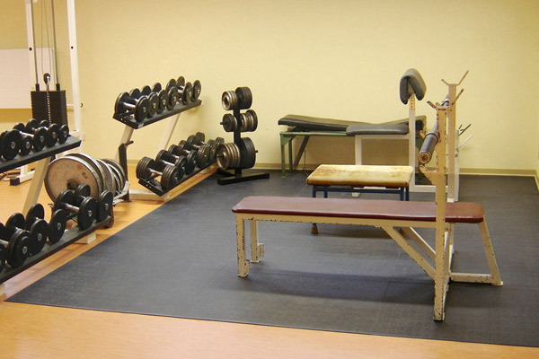 Vulkan-Grundplatten eingebaut. Im Aufwurfbereich der Langhanteln werden die nahezu unzerstörbaren Gummiplatten SSB eingesetzt, die unter großer Hitze und hohem Druck aus Gummi
