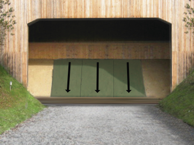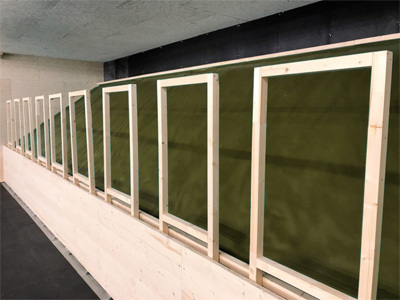 Die Montage im Geschossfang erfolgt grundsätzlich von oben nach unten. Die Befestigung erfolgt dabei nur am oberen Abschluss des Granulats z. B. mit einer Holz-Dachlatte, um welche die Folie 1-2 mal gewickelt und mit Schrauben befestigt wird. Nach unten läuft die Folie freiliegend aus, so dass diese bei Servicearbeiten am Geschossfang einfach nach oben geklappt werden kann.