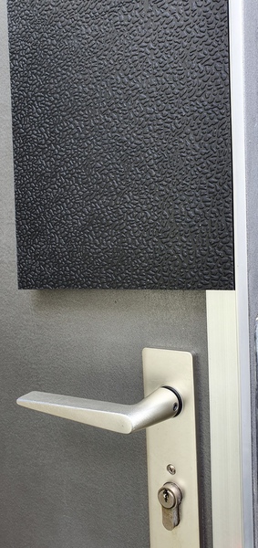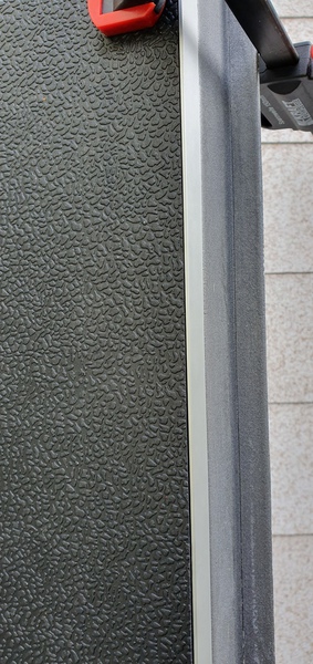 Die Platte wird mit Kontaktklebstoff (Pattex) vollflächig aufgeklebt. Als Randabschluss kann auch ein Alu-Winkel 20x20mm im Randbereich der Türe aufgenietet werden und dann die Platte eingelegt und verklebt werden.