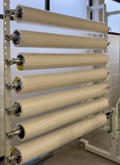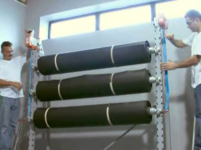 Schutzbeläge, die mit einem Aufrollgerät fest auf Wickelstangen aus Metall gewickelt wurden, werden vom Aufrollgerät unmittelbar auf mobile Lagerwagen gehängt und zum Lagerort gefahren. Bei der nächsten Verlegung wird der Belag direkt vom Lagerwagen aus abgerollt und verlegt. Dies ist der rationellste Arbeitsablauf.
