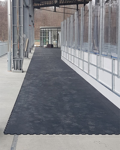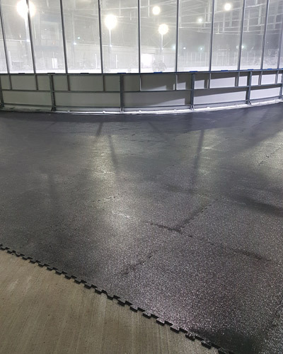 Die vulkanisierten Platten mit Puzzlesystem sind rutschhemmend und kommen z. B. als Bodenbelag in der Eissporthalle, Eisarena, Eishalle,